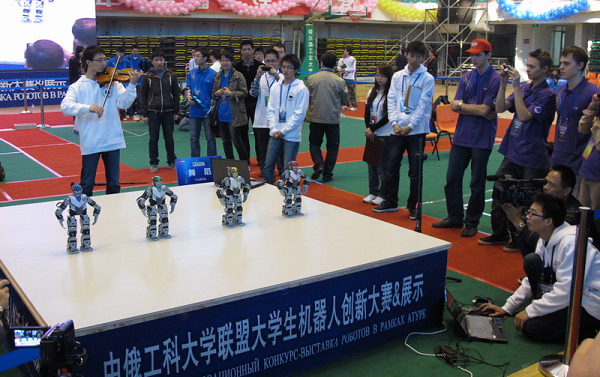為加強中俄兩國大學生的科技與文化交流,提升兩國大學生的科技創新能力,增進"中俄工科大學聯盟"內各高校間的友誼,2011年10月12日,首屆"中俄工科大學聯盟大學生機器人創新大賽及展示"活動在哈爾濱工業大學隆重開幕,本次活動由哈爾濱工業大學聯合莫斯科鮑曼國立技術大學共同主辦。中俄兩國30所一流的工科院校紛紛攜帶最能代表本校大學生科技實力和創新精華的機器人與會。我校機電學院羅慶生老師帶領機器人代表隊參加了此次活動,趙顯利副校長參加了在北京理工大學舉行的閉幕式。