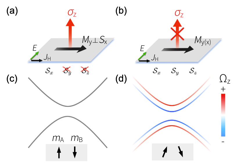 圖1: 在PT對稱的反鐵磁系統中產生面內反常霍爾效應的示意圖。