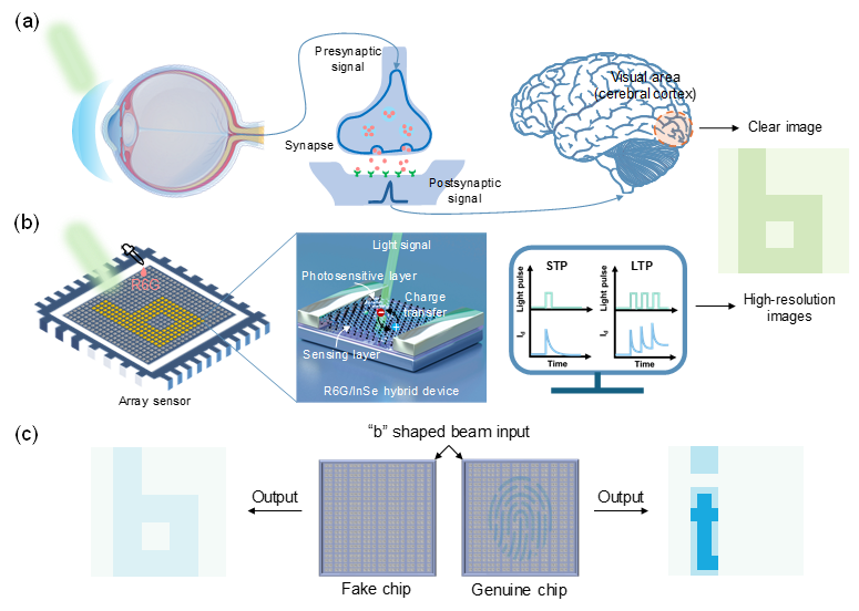 研究團(tuán)隊(duì)設(shè)計(jì)了一種R6G/InSe混合器件結(jié)構(gòu),并利用SERS驗(yàn)證了該結(jié)構(gòu)中的電荷轉(zhuǎn)移機(jī)制。這種結(jié)構(gòu)有效地模擬了生物突觸,包括突觸前膜(R6G光敏層)、突觸間隙(R6G/InSe界面)和突觸后膜(InSe傳感層)。該結(jié)構(gòu)中的電荷轉(zhuǎn)移過程與神經(jīng)遞質(zhì)在突觸間隙中的傳遞過程非常相似。團(tuán)隊(duì)利用表面處理技術(shù)來調(diào)節(jié)電荷轉(zhuǎn)移過程,從而開發(fā)出基于雙重加密的片上防偽應(yīng)用。