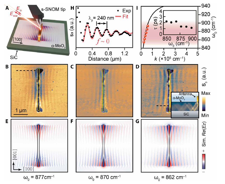 圖2展示了碳化硅襯底上氧化鉬材料中極化激元的近場光學圖像。研究人員基于納米級空間分辨率的紅外近場光學成像技術對極化激元傳播行為進行實空間成像。圖A給出了紅外納米成像的示意圖,通過金屬納米天線激發氧化鉬中的極化激元,針尖逐點掃描將近場信號散射到遠場探測器,最后獲得實空間圖像。圖B-D分別是不同入射光波數下極化激元的實空間成像,極化激元沿著水平方向高度定向傳播,即非衍射傳播。圖E-G為相應的數值模擬結果,與實驗結果符合良好。圖H中展示了極化激元傳播的波形圖,可以提取出極化激元非衍射傳播的波長。圖I給出了非衍射傳播極化激元的光學色散和傳播壽命。