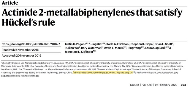 近日,北京理工大學化學與化工學院引進的特立青年學者謝靜教授在《Nature》雜志上合作發表題為“Actinide 2-metallabiphenylenes that satisfy Hückel’s Rule”(符合“休克爾定律”的錒系金屬取代亞聯苯化合物)的文章(Nature 2020, 578, 563-597), 錒系金屬讓芳香性和反芳香性環共存。謝靜教授為該論文的共同第一作者,負責完成論文的理論計算部分,此研究是與美國洛斯阿洛莫斯國家實驗室Jaqueline L. Kiplinger課題組以及美國明尼蘇達大學Laura Gagliardi教授合作完成。