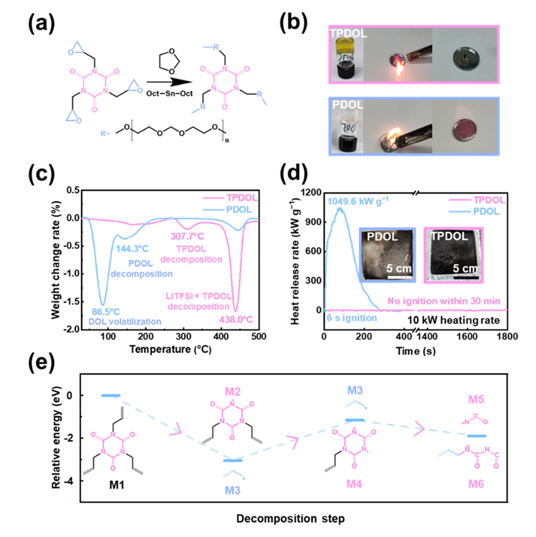 由于固態電解質具有固有的高熱穩定性、不流動性和正/負極兼容性,因此電解質的固態化成為解決電池的安全性問題的終極方案。自支撐固態電解質具有較差的電極/電解質界面接觸,不利于電池長期穩定循環,而原位聚合電解質因較好的界面接觸和較低的界面電阻而受到越來越多的關注。然而,傳統的聚烯烴基聚合物電解質通常需要添加額外的液態電解質,這不可避免地會影響電池的安全性。原位聚合1,3-二氧戊環(PDOL)是一種通過DOL開環聚合獲得的聚醚基電解質,其不僅擁有較高的鋰離子電導率(>1 mS cm?1),且與金屬鋰負極具有出色的兼容性而廣受贊譽。盡管PDOL電解質不需要添加液態潤濕劑,但DOL單體的殘留和低聚物的存在會降低電池的安全性。一旦電池溫度超過110 ℃,PDOL電解質就會發生熱分解,生成氣態易燃小分子產物(如DOL、甲醛等),影響電池安全性能。事實上,金屬鋰電池的熱安全性主要與電解質的熱穩定性及其在高溫下與金屬鋰負極的相容性有關。因此,同時實現PDOL的高熱穩定性與高電化學穩定性仍然是安全性金屬鋰電池的巨大挑戰。