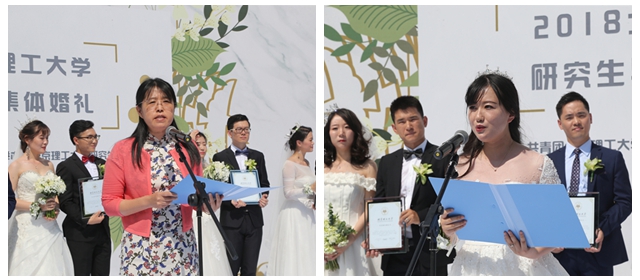 導(dǎo)師代表機電學(xué)院楊利教授為新人們送上了最誠摯的祝福,新人代表化學(xué)與化工學(xué)院博士生王珊代表本次婚禮的所有新人溫情致謝。典禮最后,新娘們向現(xiàn)場的觀眾拋出了代表幸運和美好祝愿的手捧花,新郎和新娘們在許愿池倒下慶祝的香檳酒。