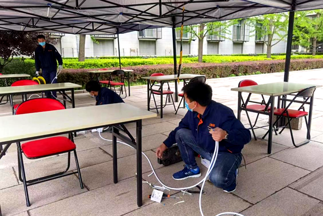 “接到臨時通知,根據屬地政府部門有關要求及學校疫情防控工作領導小組統一安排,明早9點,還要繼續進行一輪全員核酸檢測……”電話鈴聲突然響起,打破了黑夜的沉寂,后勤服務公司各部門聞令而動,溝通部署。早上5點天剛亮,師傅們就開始搭建核酸檢測帳篷、接通臨時電源、布置桌椅、設置隔離帶、鋪設兩米線、運送防護服、咽拭子試管等相關物資……一項項工作井然有序。